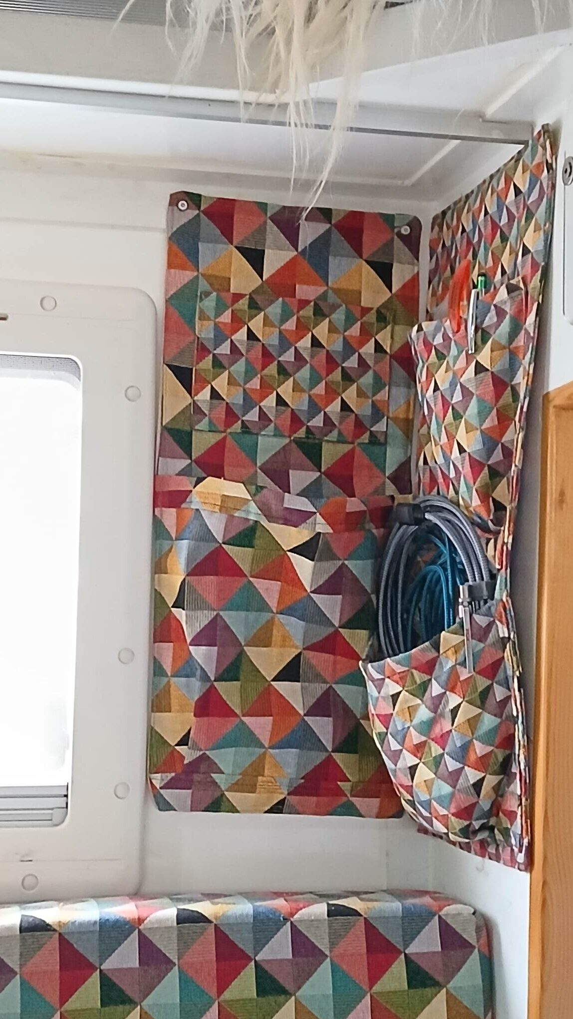 Dann wurden die zwei neuen Taschen an die Wand geschaubt. Edelstahlschrauben und Rosetten im wohl sortierten Kellerlager auf anhieb gefunden. Löcher in den Stoff stanzen, anzeichnen, bohren, schrauben, fertig.