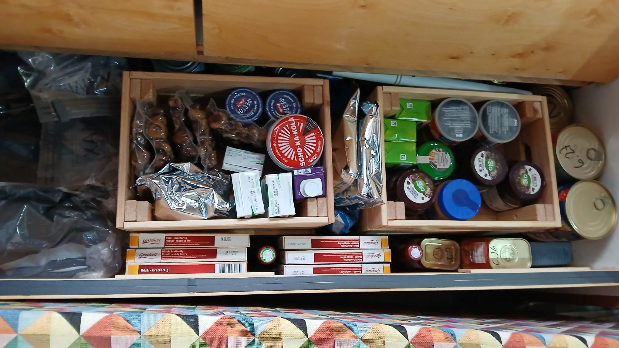 Dienstag und ich gehe meiner Lieblingsbeschäftigung nach, umräumen. Die Sitzbank/Speisekammer muss neu geordnet werden. Eine neue Reihe an Dosen, Gläsern und Co ist dazugekommen. Anfangs einfach vor die kleinen Kisten gestellt, erweist sich diese Lösung als suboptimal. Die Neuankömmlinge rausgeräumt und die kleinen Kisten eine Dosenbreite vor/nach links gerückt. Nun lagern die Neuen zwischen den Kisten und kullern nicht durch die Gegend. Wobei das bei der augenblicklichen Fülle gar nicht geht. Aber wenn die Bettdecke oder der Anorak gebraucht wird, stürzt das Kartenhaus sonst ein.