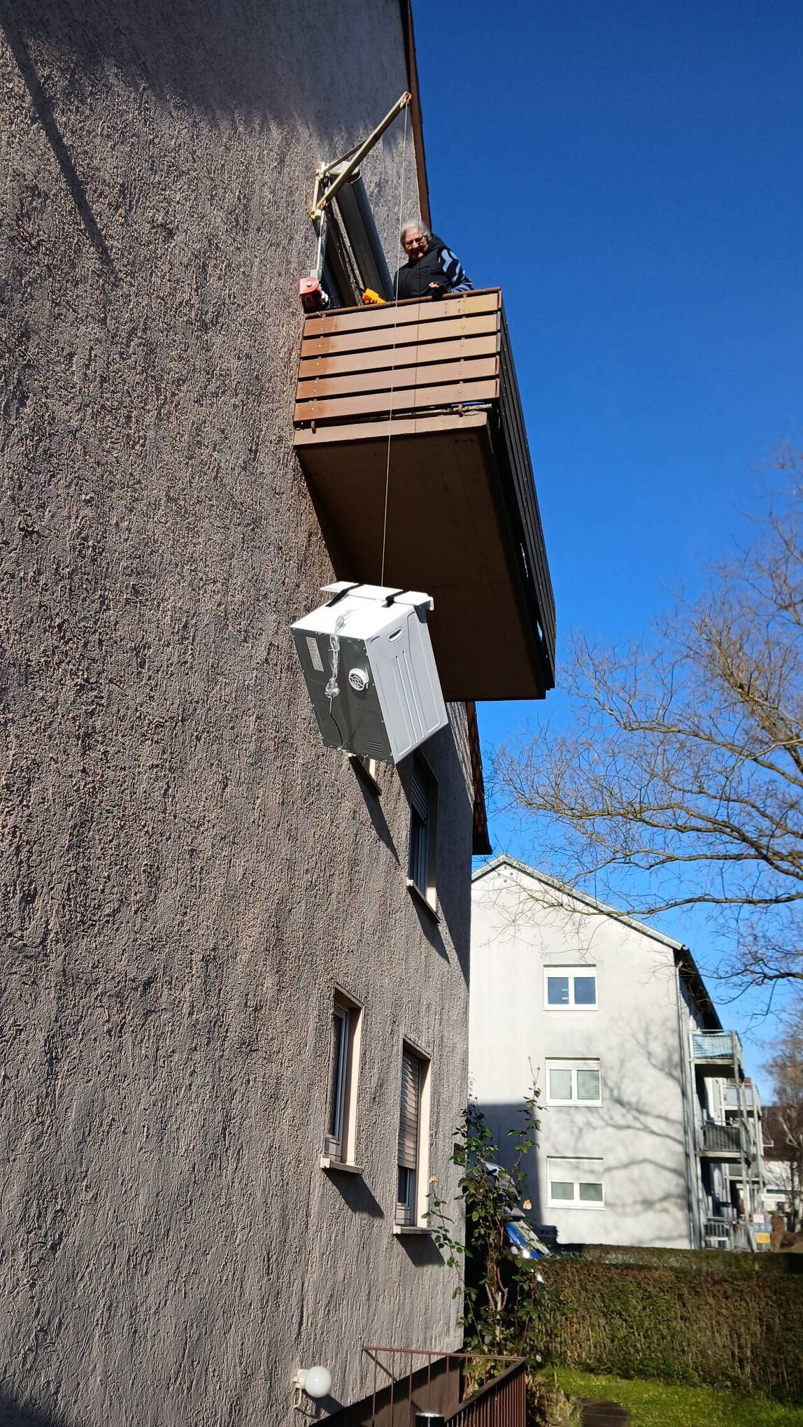 Der Wäschetrockner kommt. Mit dem Paketboten zum Kran geschleift und ausgepackt. Nachdem ich in angeschlagen habe, hat Prinzessin ihn in die Burg gezogen.