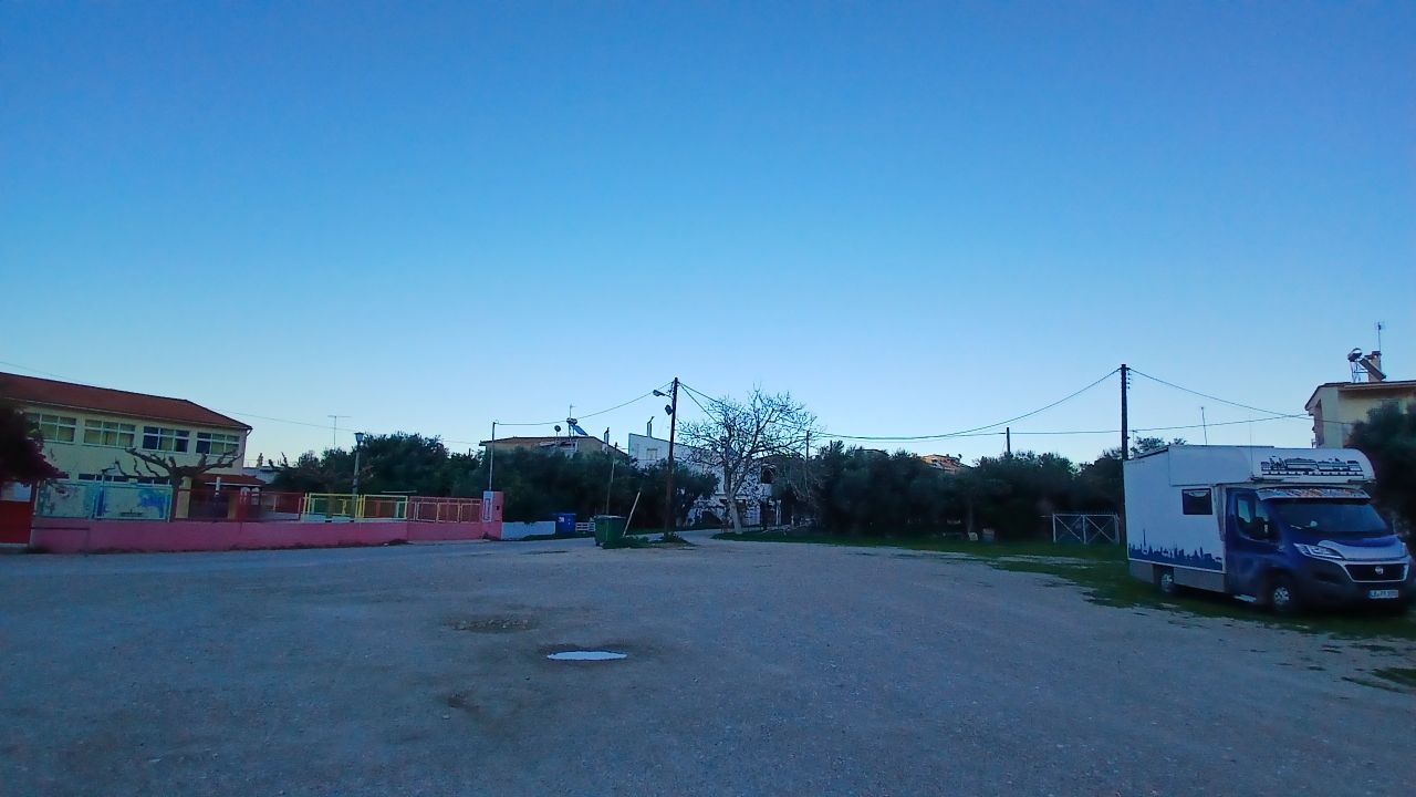Die erste Alternative, ein Parkplatz außerhalb, überzeugt mich aus unerfindlichen Gründen nicht. Wir fahren rund 8km weiter und finden einen kleinen Hafen. Aber der Wind ist sehr stark und peitscht das Meer auf. Wenn ich hier aufbaue, bekommt Prinzessin keine Minute Schlaf. Da finde ich bei P4N einen Platz, auf dem schon Leute vor mir Schutz vor dem Wind gesucht haben. Ein großer Parkplatz mitten im Ort vor einer Schule.