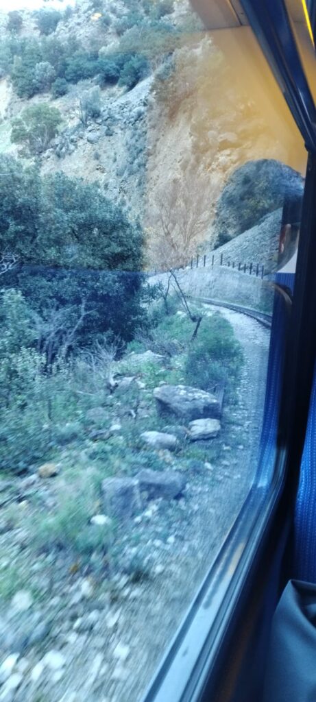Das Wort Platz ist nicht ganz korrekt. Es müsste heißen Plätzchen. Nicht nur die Spurweite der Bahn ist schmal, auch die Sitzplätze. Körperkontakt zum Gegenüber ist unvermeidlich. Egal, die Schlucht ist beeindruckend und der Zug rattert schaukelnd den Berg hinauf.
