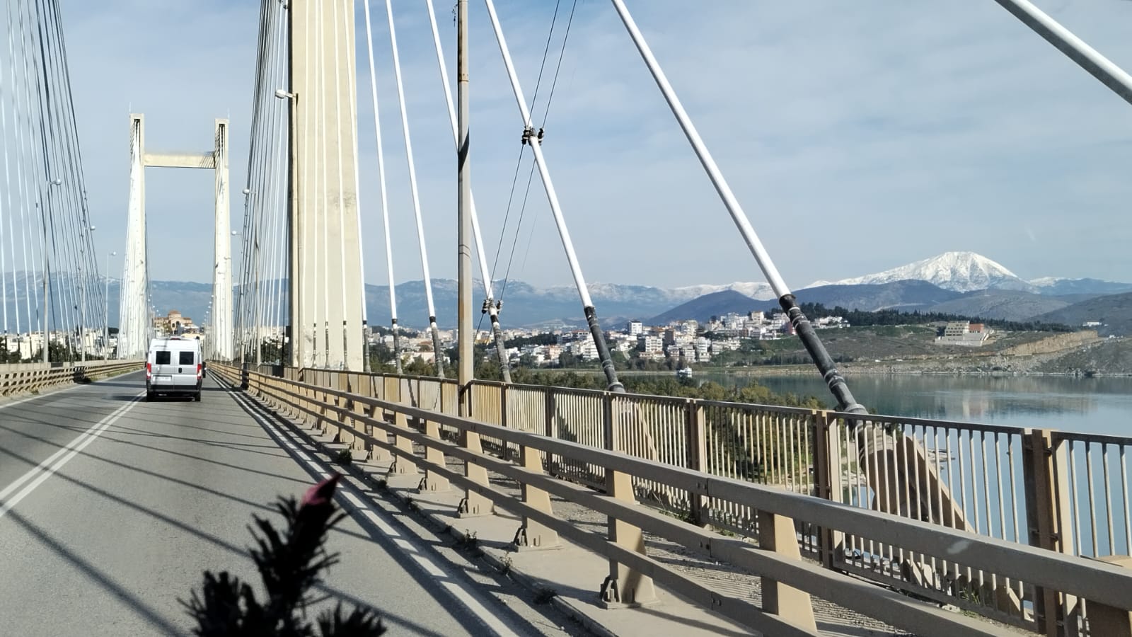 Wir teilen mit WhatsApp den Live-Standort und ich halte bei der Autobahnausfahrt an und warte. Eh nicht sehr lange, dann sind wir wieder hintereinander. Aus Kostengründen haben wir keine Fähre auf die Insel Euböa, sondern die Neue Evripos-Brücke gewählt. Fünfzig Euro ist uns der Spaß nicht wert.