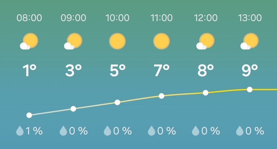 Es ist gegen morgen sehr kalt (0°) geworden und die Heizung kämpft dagegen an. Die Vorhersage lässt trotzdem einen schönen Tag erhoffen.