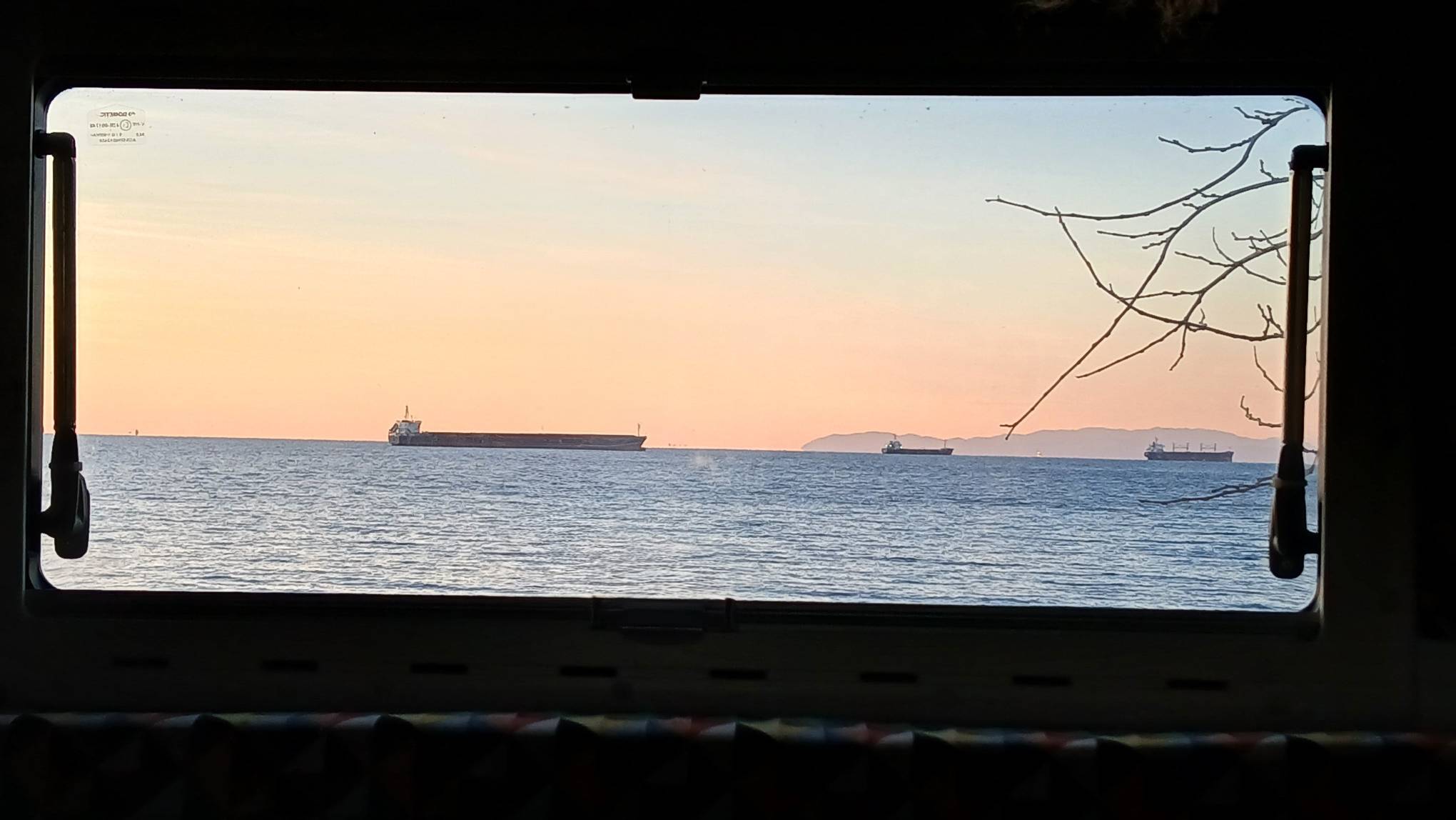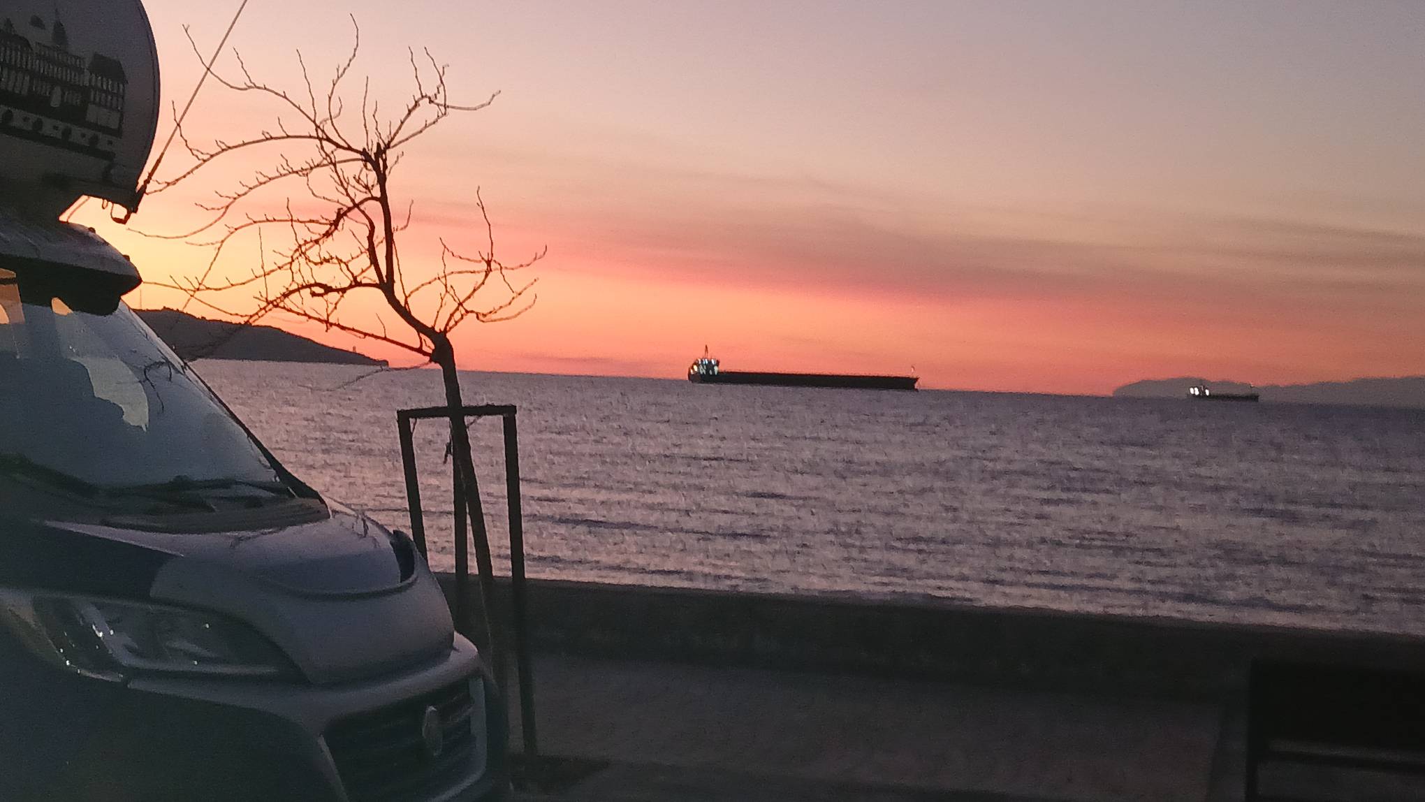Die Abendstimmung war grandios. Ruhiges Meer, orangeroter Himmel und beleuchtete Schiffe.
