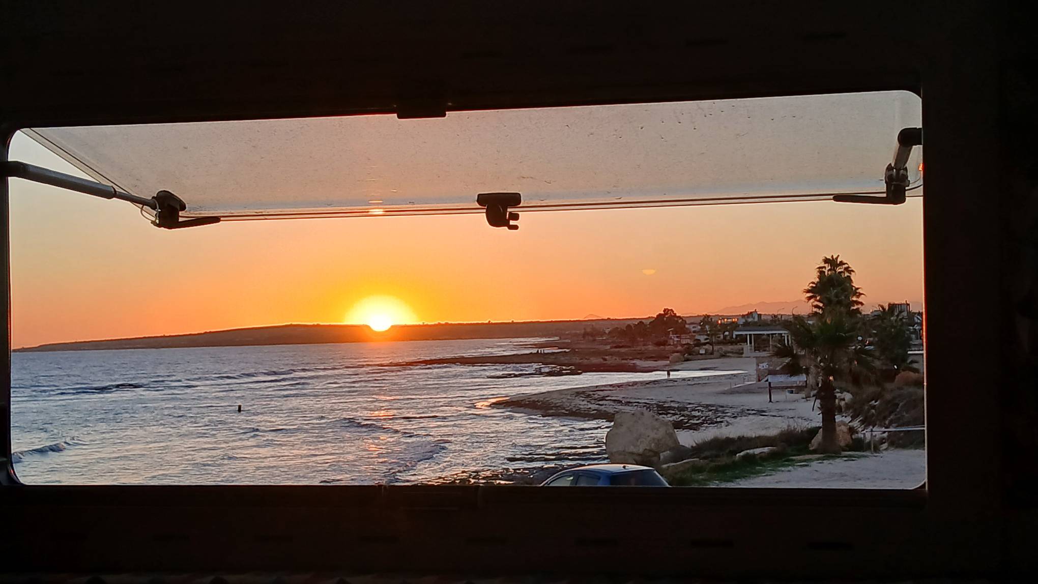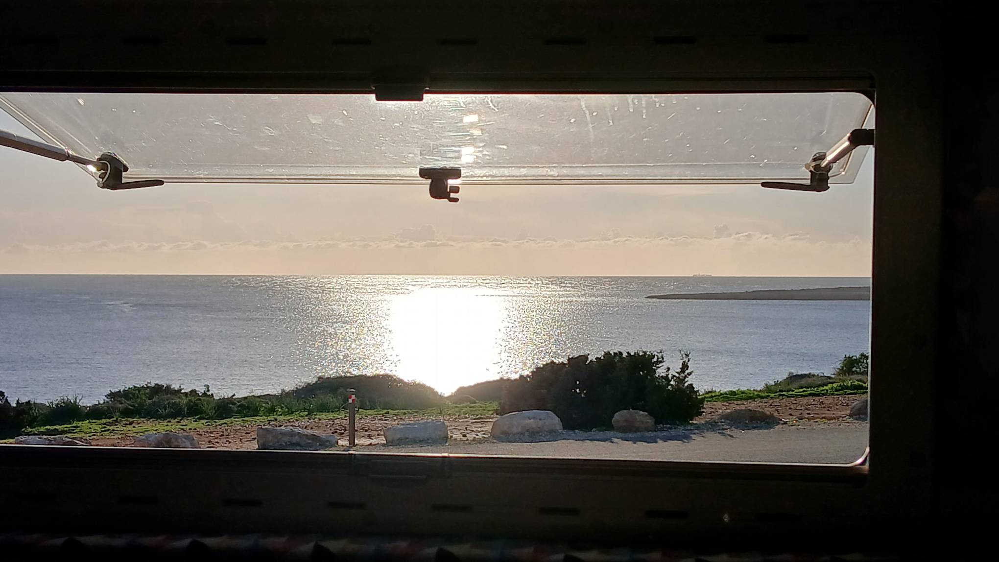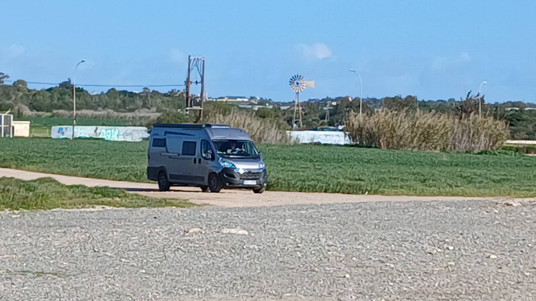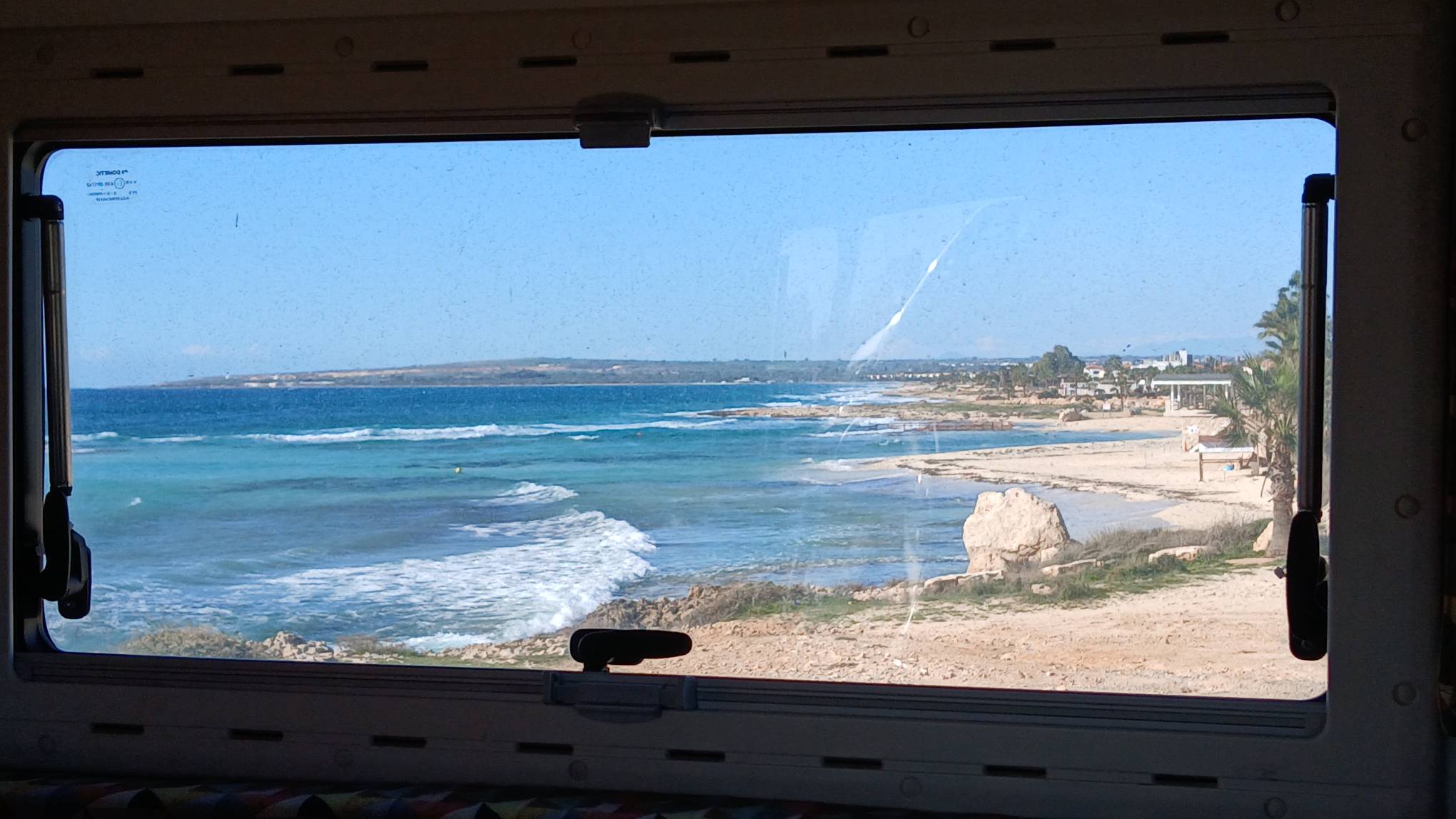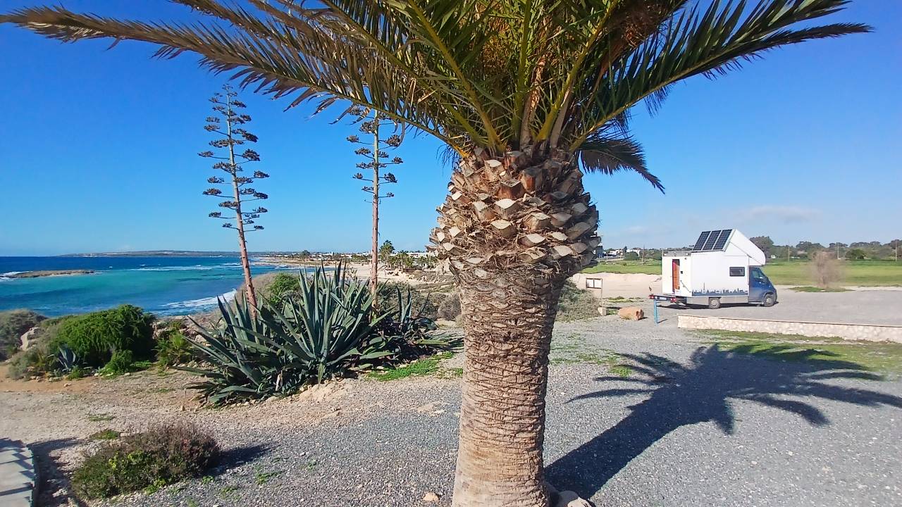 Wir kommen an der Ayia Thekla Chapel an und ich mustere das schräge Gelände. Suche einen schönen Platz und denke, mit Keilen kriege ich den Wagen waagerecht. Als ich die Stellung wegen dem Sonnenstand nochmals korrigierte, rollte er mit den höheren Rädern in eine Auswaschung und stand perfekt ohne weiteres zutun.