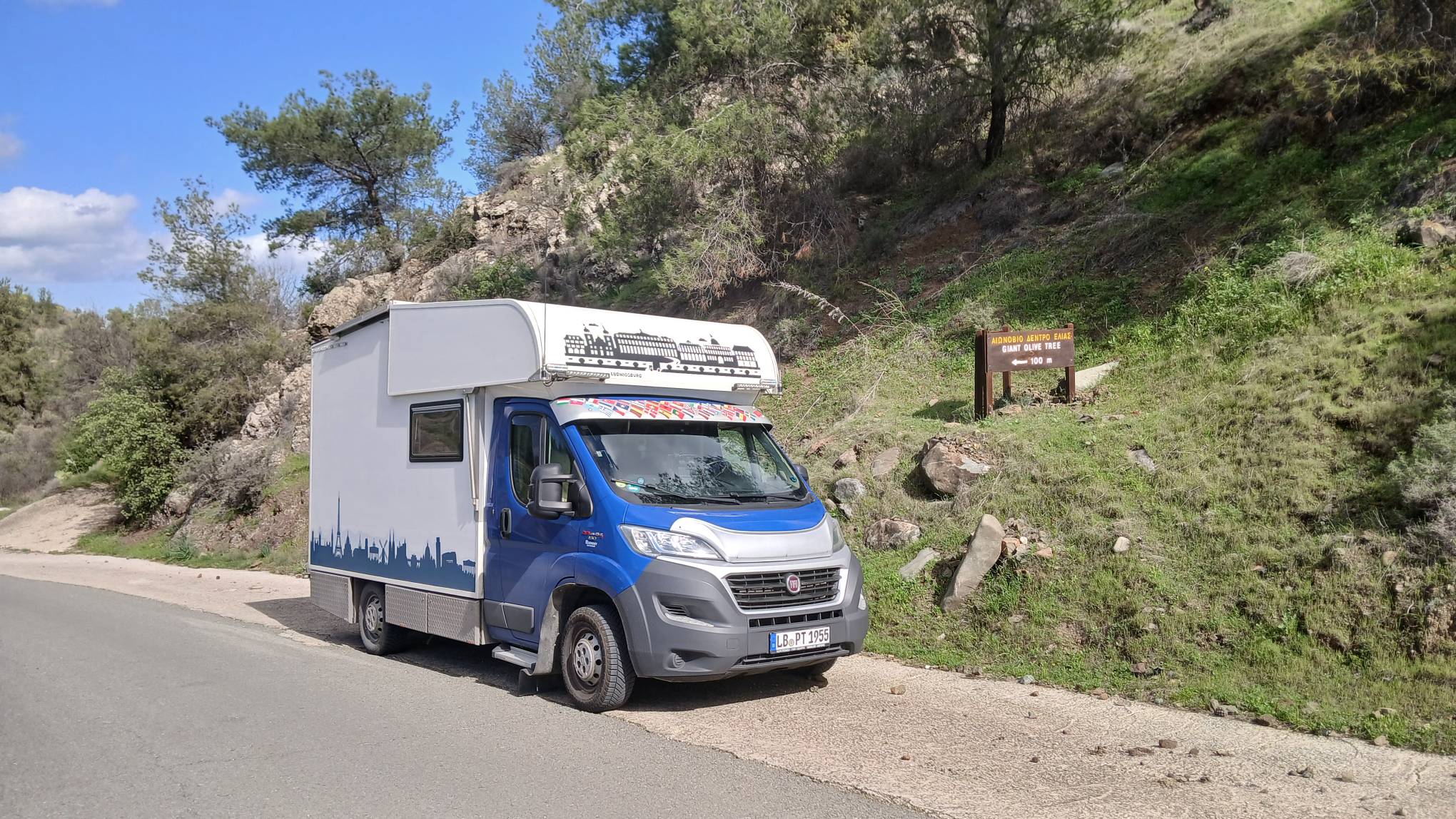 Auch wir fahren weiter und wollen die Olivenbäume anschauen. Ein großer Müllcontainer bettelt um unseren Müll und so stoppen wir kurz.