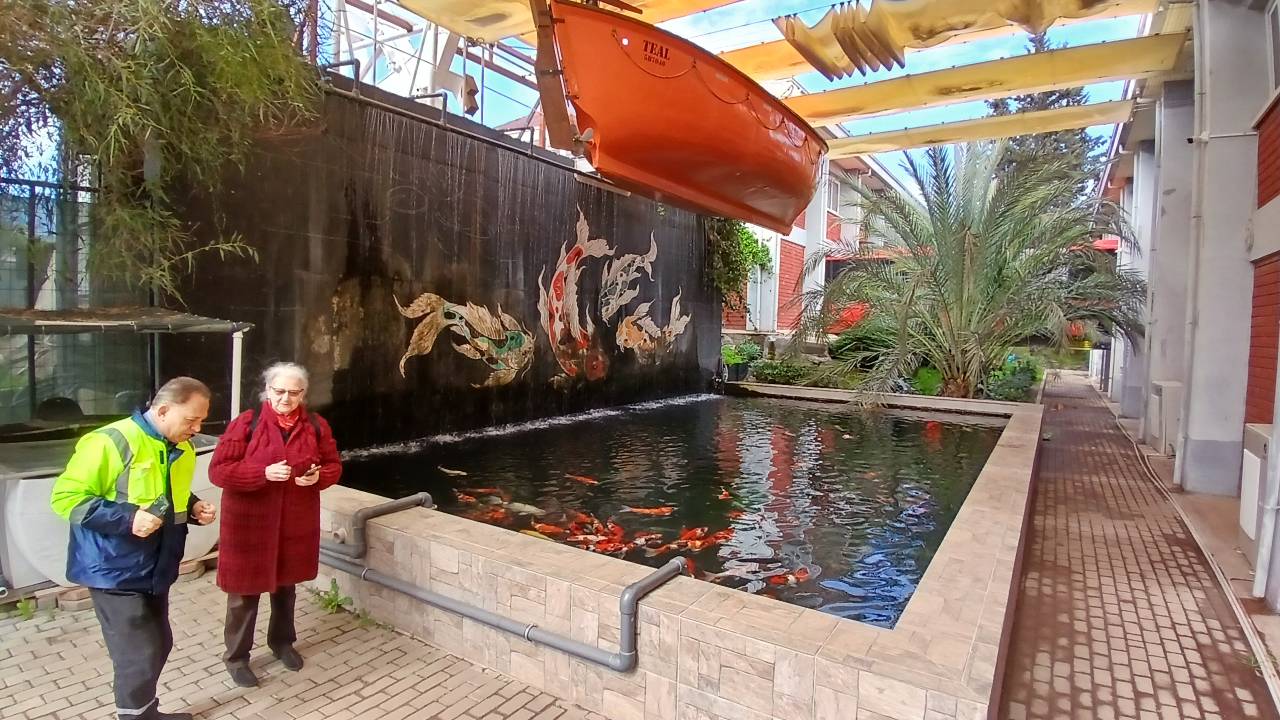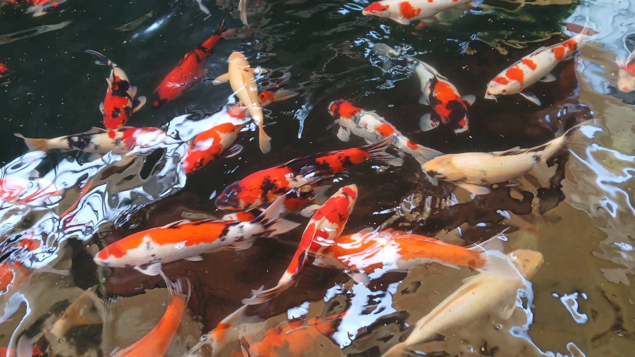Als wir mit unserer Runde fertig sind, gehen wir zum Eingang zurück um uns zu verabschieden. Er führt uns zu seinem Koi-Becken und plaudert noch etwas mit uns.