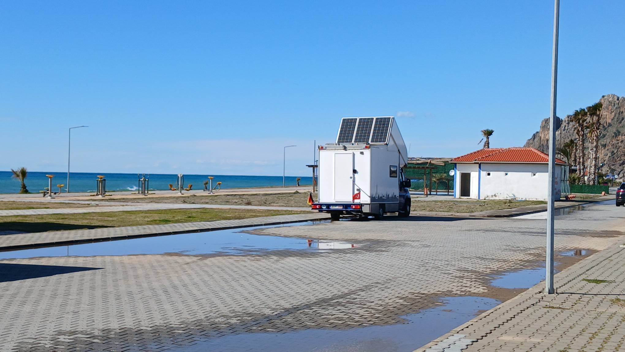 Links von uns die Strandpromenade und dahinter das unendliche Meer. Die Sonne straht und über uns ist kein Wölkchen zu sehen. Einzig der eiskalte Wind aus den Bergen stört ein bisschen.