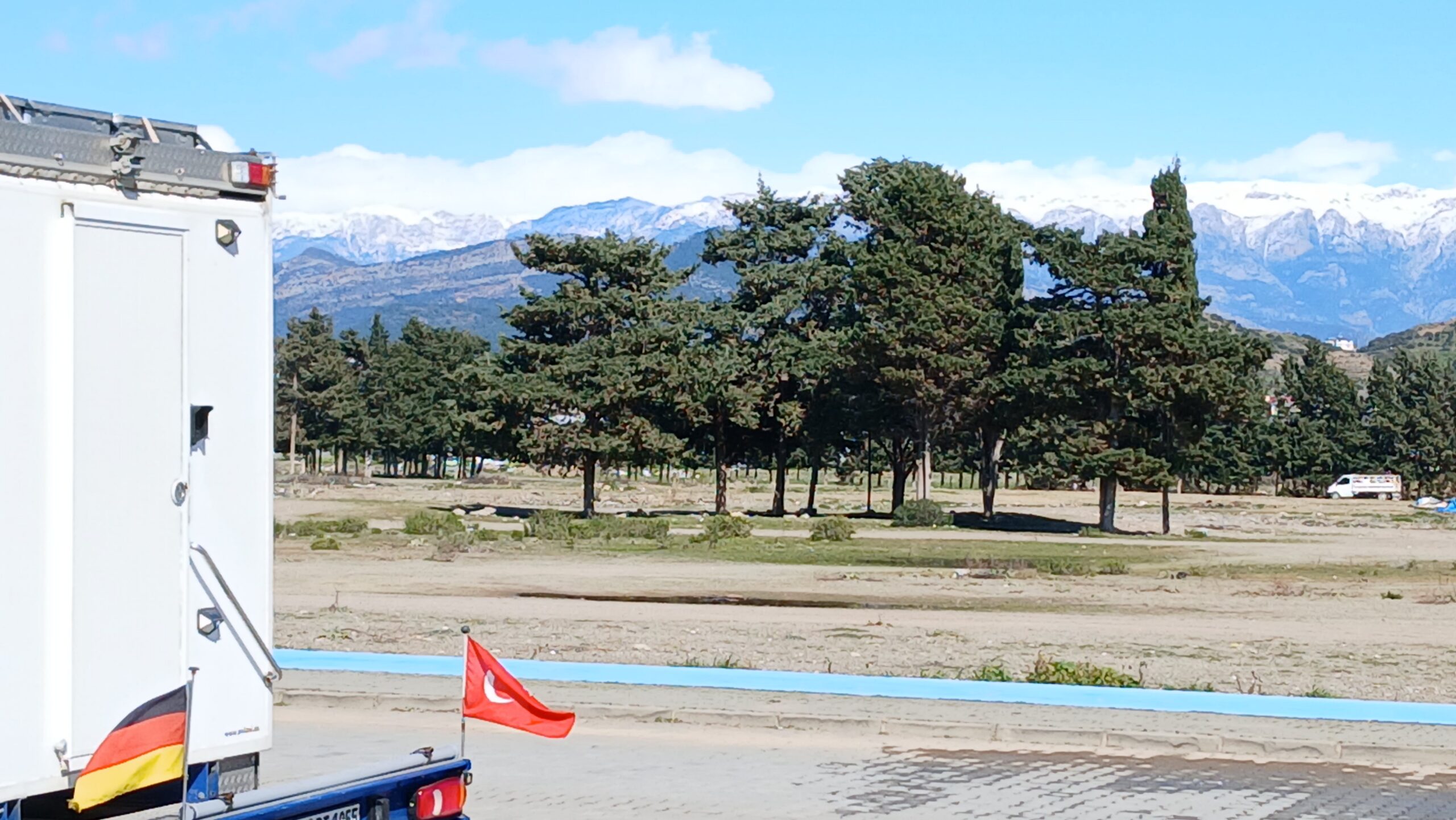 Der Platz ist schon große Klasse. Rechts von uns, weit entfernt die Stadt. Noch weiter weg, die schneebedeckten Berge.