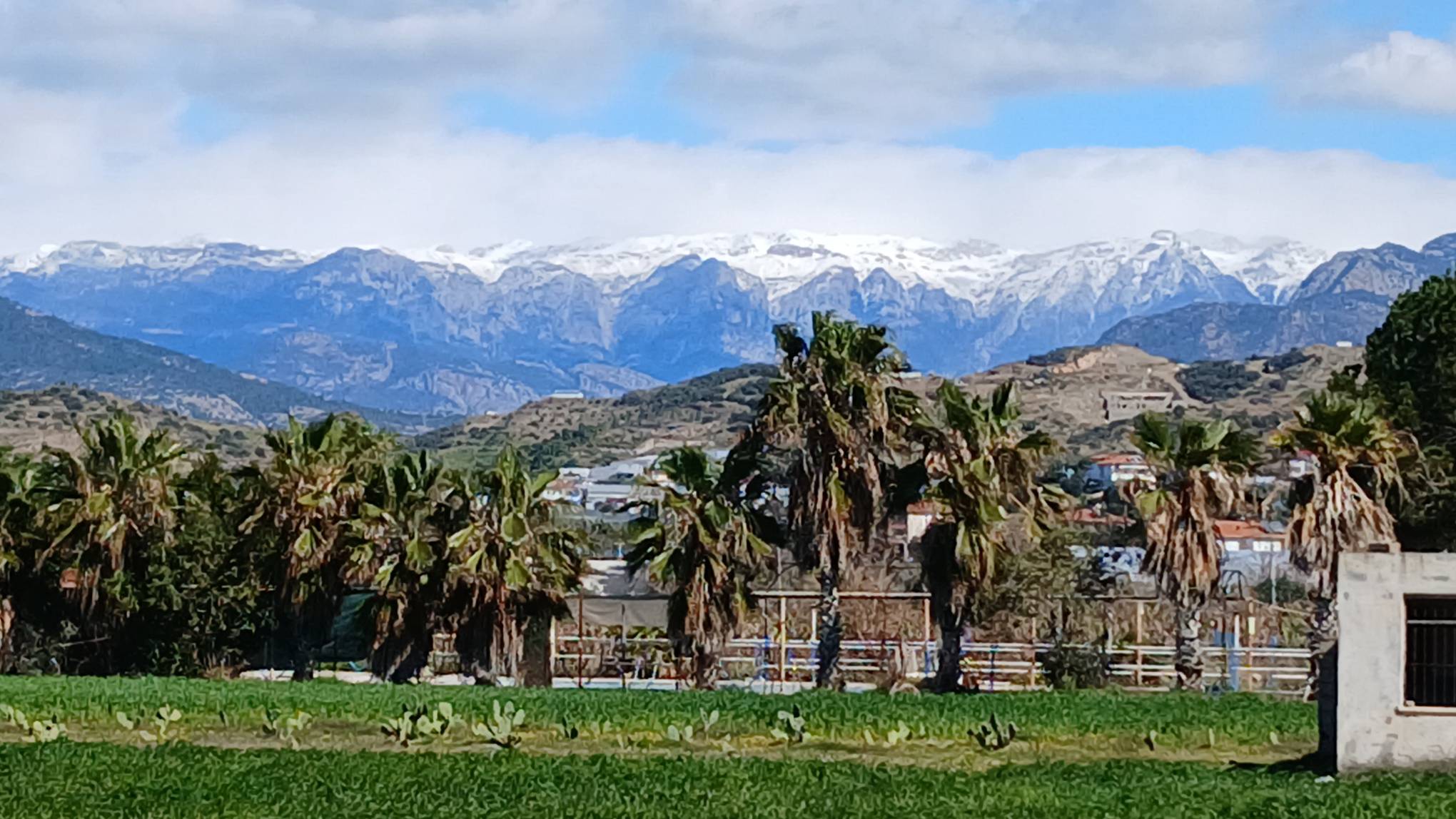 das Bild mit den Palmen vorn und den schneebedeckten