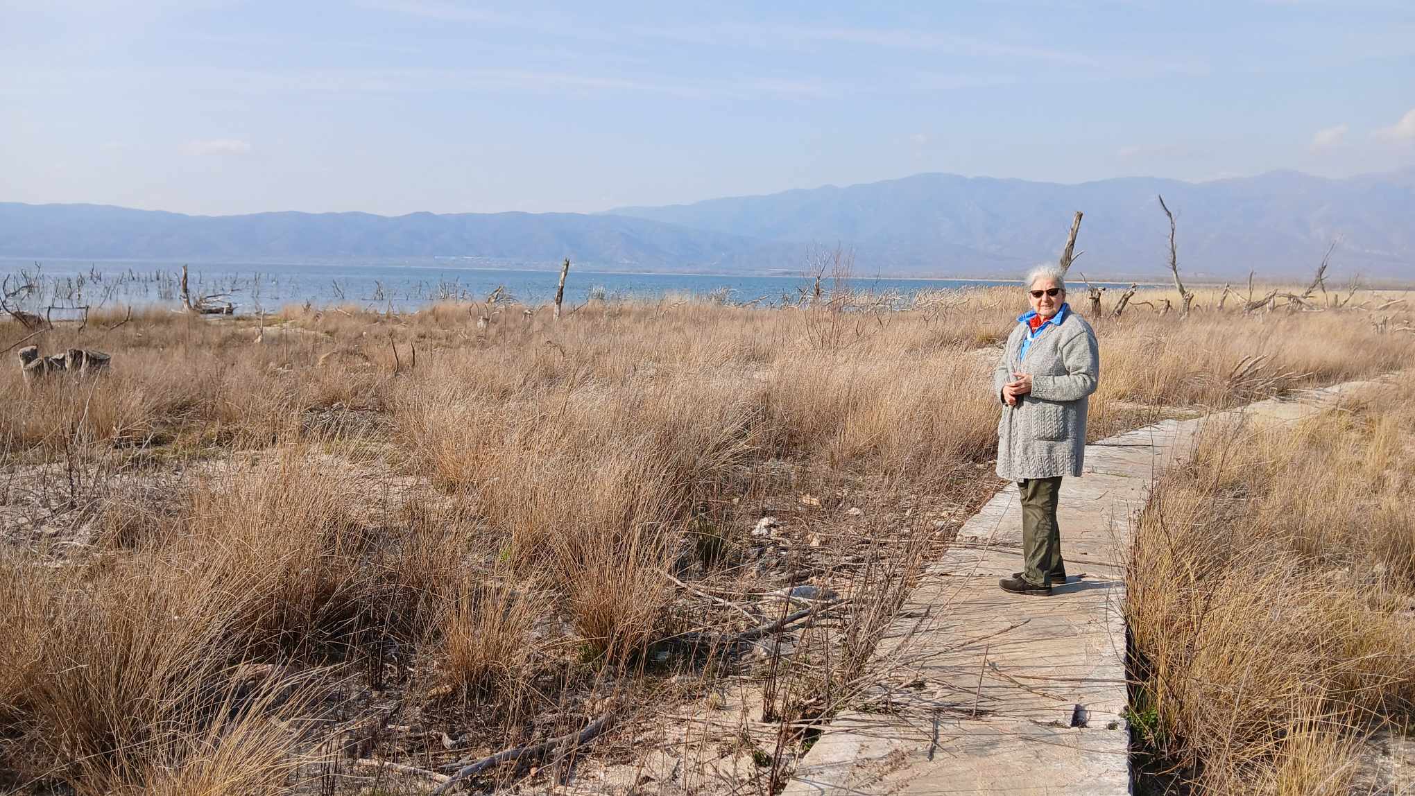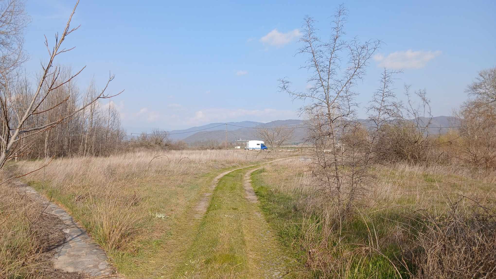 Machen einen Spaziergang zum Ufer des Dojransee. Ein kleiner gepflasteter Fußweg führt an einer Grillhütte bis durch den Schilfgürtel und kreuzt dabei eine Fahrspur. Nach dem Schilfgürtel steht der Pkw eines Anglers.