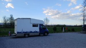 Ermattet im Womo angekommen, gab es Kaffee und eine Cremeschnitte. So gestärkt haben wir die letzten Kilometer gemeistert und sind etwas nach 18 Uhr auf dem Camper stop Bistra, der erste auf der Reise, angekommen. Zwischenzeitlich kostet die Übernachtung 10€ oder mindestens 25€ Verzehr im Restaurant.